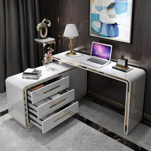 Chiếc bàn này nổi bật với thiết kế chữ L thông minh, có thể thay đổi kiểu ghép giúp tận dụng không gian góc tối đa và mở rộng diện tích sử dụng. Gam màu trắng kết hợp viền vàng mang đến sự tinh tế, thanh lịch, phù hợp với những ai yêu thích phong cách hiện đại và tối giản nhưng vẫn đầy sang trọng. Mẫu bàn phù hợp với những không gian làm việc cao cấp, văn phòng giám đốc hay phòng làm việc tại nhà.
