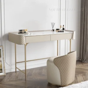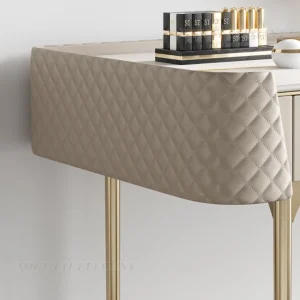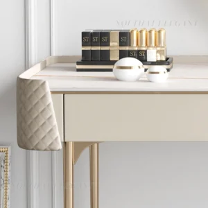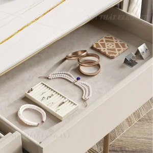 Với tông màu trắng, nổi bật với các chi tiết bọc da, mặt đá Ceramic cao cấp và khung kim loại mạ, bộ bàn trang điểm sẽ là điểm nhấn sang trọng trong phòng ngủ của bạn. Với 2 ngăn kéo rộng rãi để lưu trữ đồ trang sức, mỹ phẩm và đồ làm đẹp .
