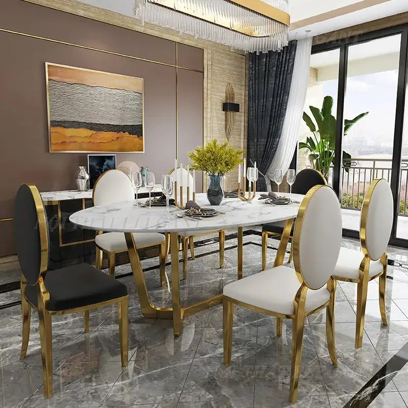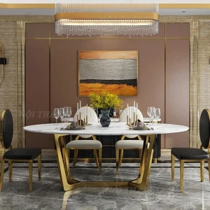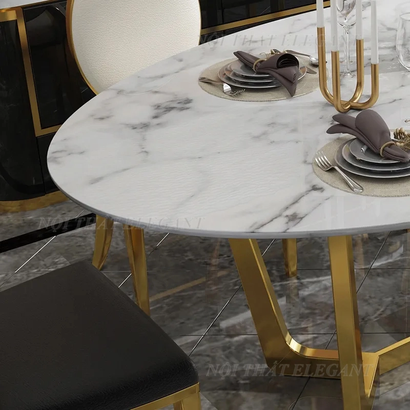 Với phong cách hiện đại, bộ bàn ăn chân inox mạ PVD này là sự bổ sung hoàn hảo để cải thiện không gian sống của bạn. Mặt bàn được thiết kế hình bầu dục càng tôn lên vẻ đẹp của đá Cẩm thạch và mang đến cho sản phẩm một nét cách điệu nhưng cũng rất tinh tế.