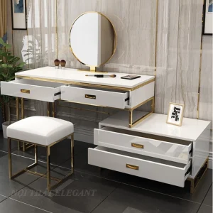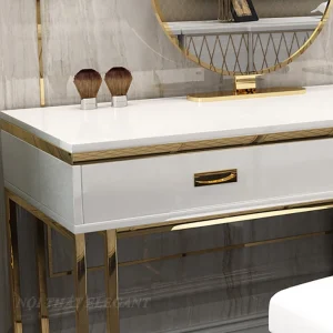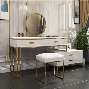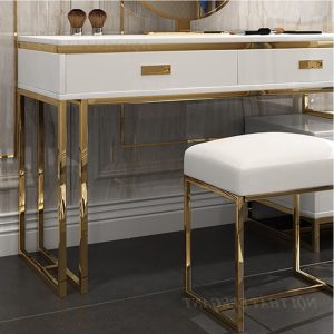 Mẫu Bàn trang điểm được tạo điểm nhấn với các đường nét thiết kế trang nhã, bàn trang điểm cao cấp khung inox mạ PVD này mang đến vẻ đẹp tinh tế sang trọng, dễ dàng kết hợp hài hòa với nhiều phong cách nội thất khác nhau.