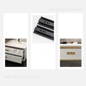 - Tông màu trắng kết hợp cùng khung inox mạ PVD màu vàng bóng mang đến cảm giác sang trọng, tinh tế .