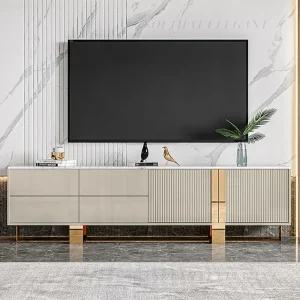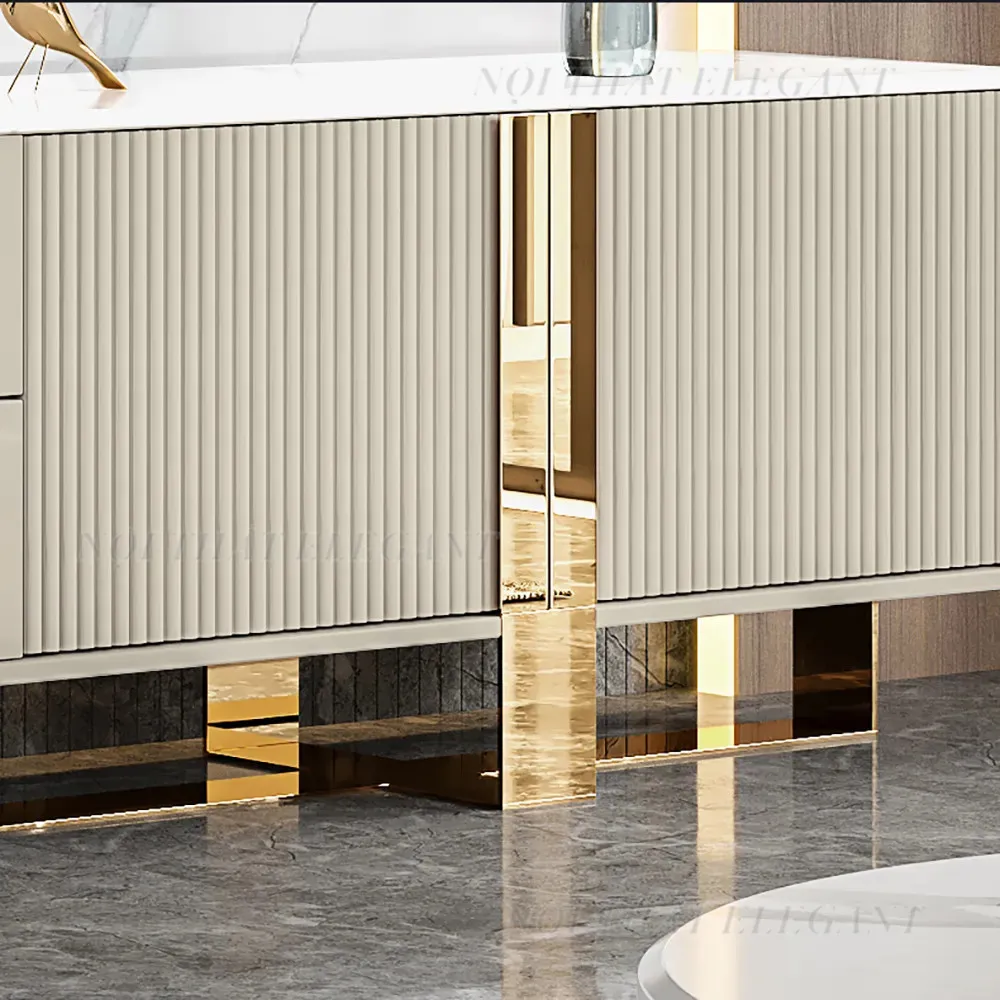 Với sự kết hợp giữa màu trắng thanh lịch và inox mạ vàng sang trọng, sản phẩm kệ tivi mặt đá này phù hợp với nhiều phong cách nội thất như hiện đại,classic, luxury. Không chỉ đẹp mắt, kệ còn được thiết kế với nhiều ngăn chứa đồ tiện lợi, giúp tối ưu hóa không gian và giữ cho phòng khách luôn gọn gàng.