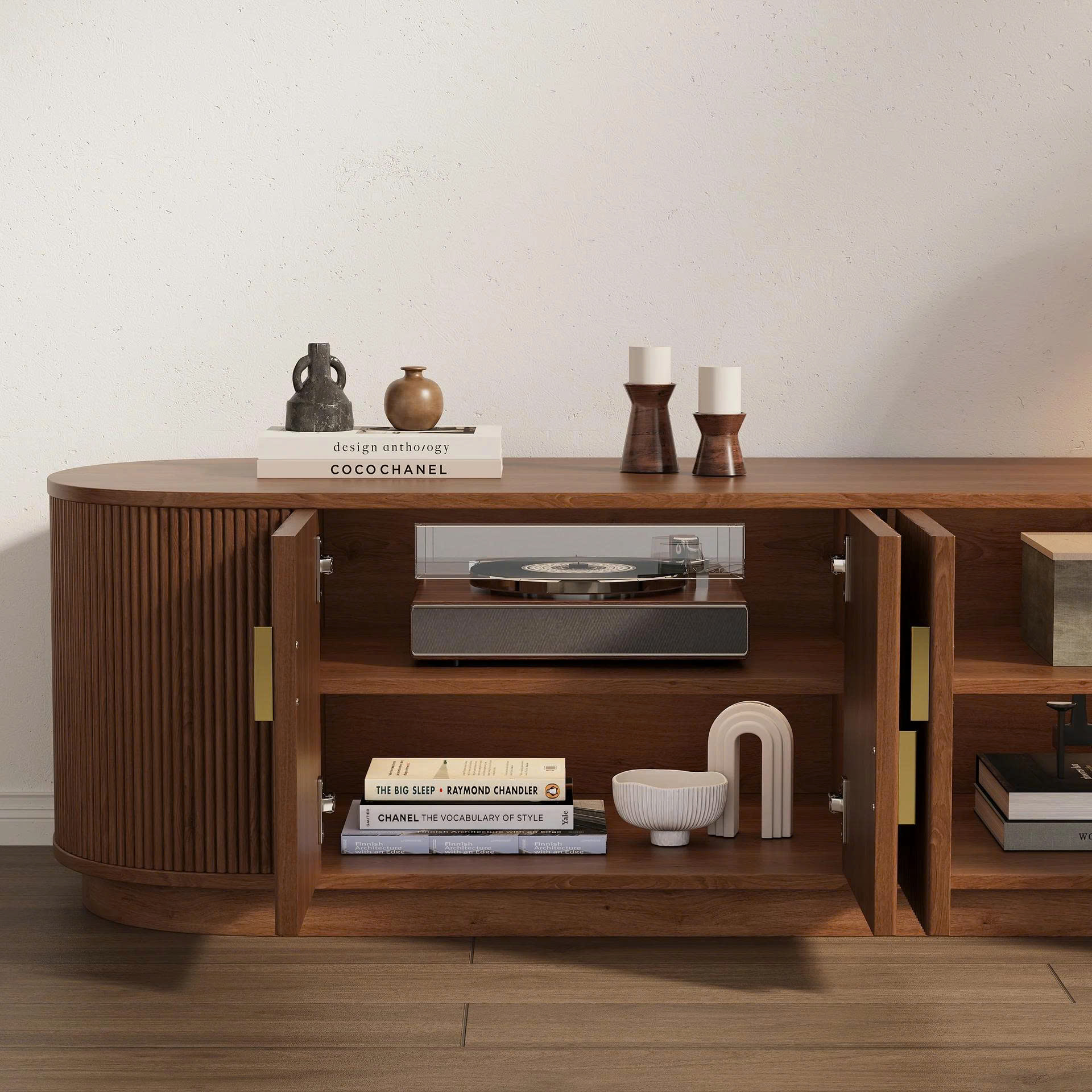 Gồm 3 hộc tủ lớn giúp lưu trữ gọn gàng các thiết bị điện tử, đầu DVD hoặc phụ kiện trang trí.