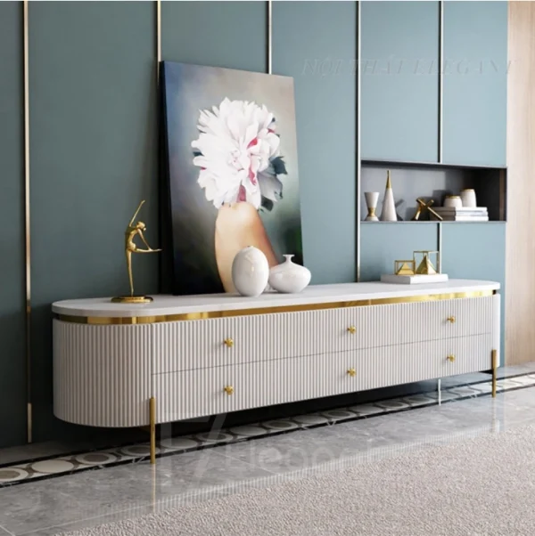 Kệ tivi mặt đá được thiết kế nổi bật với nét sang trọng nhẹ nhàng, cổ điển độc đáo này sẽ là sự lựa chọn tuyệt vời cho ngôi nhà của bạn. Với thiết kế dạng gợn sóng và mặt trên bằng đá Cẩm thạch, sản phẩm kệ tivi này sẽ mang lại cho bạn trải nghiệm độc đáo.