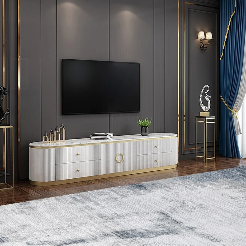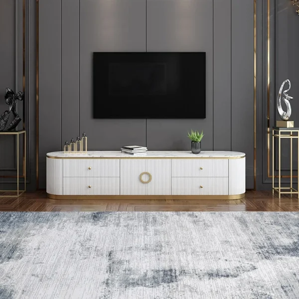 Kệ tivi được thiết kế với kiểu dáng hiện đại, cùng những đường bo cong 2 đầu một cách tinh tế mang đến sự chắc chắn cho sản phẩm và sự an toàn cho trẻ em khi chơi đùa. Mặt kệ tivi bằng đá Cẩm thạch cao cấp kết hợp cùng màu sơn trắng và điểm nhấn là phụ kiện tay nắm bằng inox mạ màu gold mang lại vẻ sang trọng cho không gian phòng khách gia đình bạn .