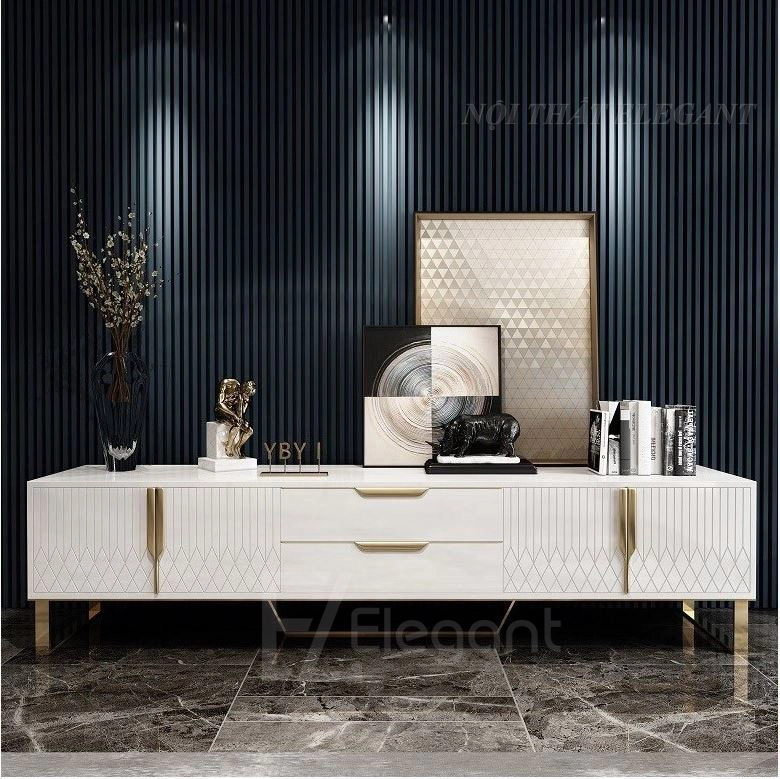 Kệ tivi mặt kính cao cấp, chân inox mạ PVD, có 2 ngăn kéo và 2 ngăn mở – EL-TV18