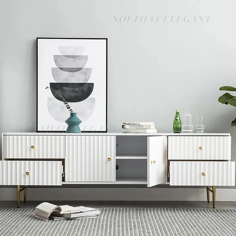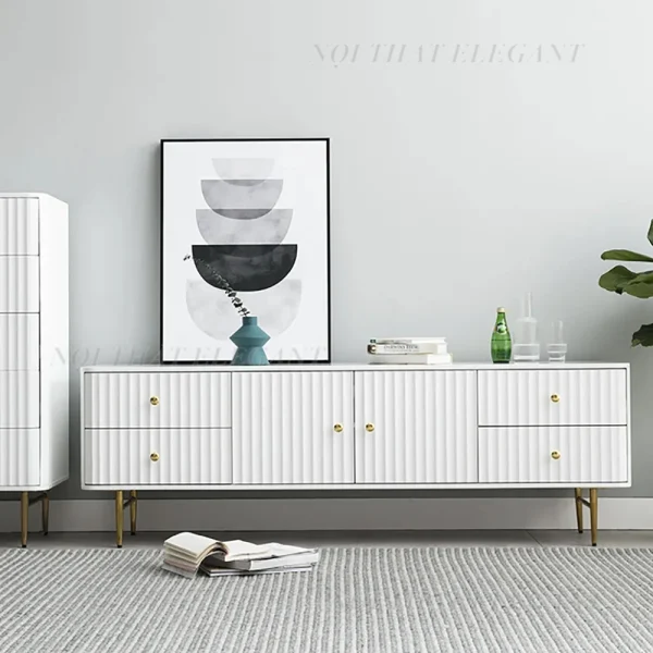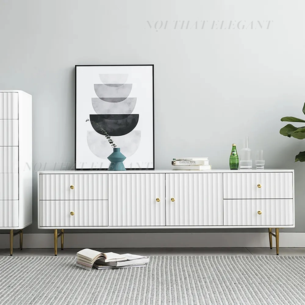 Với kiểu dáng thanh lịch, trang nhã, sản phẩm kệ tivi này góp phần tô điểm không gian phòng khách gia đình bạn thêm sang trọng hơn. Thiết kế 4 ngăn kéo và ngăn mở 2 cánh ở giữa giúp tăng thêm không gian lưu trữ các vật dụng truyền hình, giúp phòng khách được gọn gàng hơn .