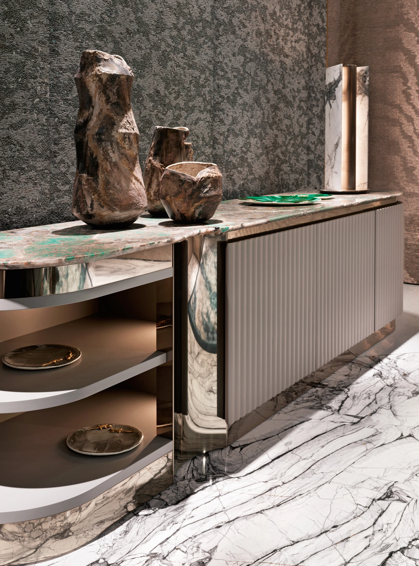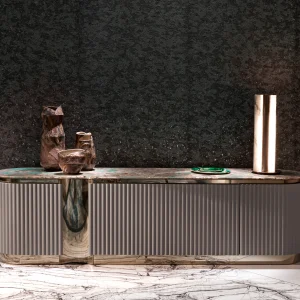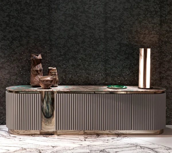 Kệ tivi cao cấp mang phong cách sang trọng, được thiết kế tinh tế với những đường cong mềm mại và điểm nhấn là sự kết hợp giữa những chất liệu cao cấp như inox mạ PVD màu gold, đá nung kết vân Cẩm Thạch nhập khẩu sẽ là sự lựa chọn hoàn hảo để nâng cấp không gian phòng khách gia đình bạn .