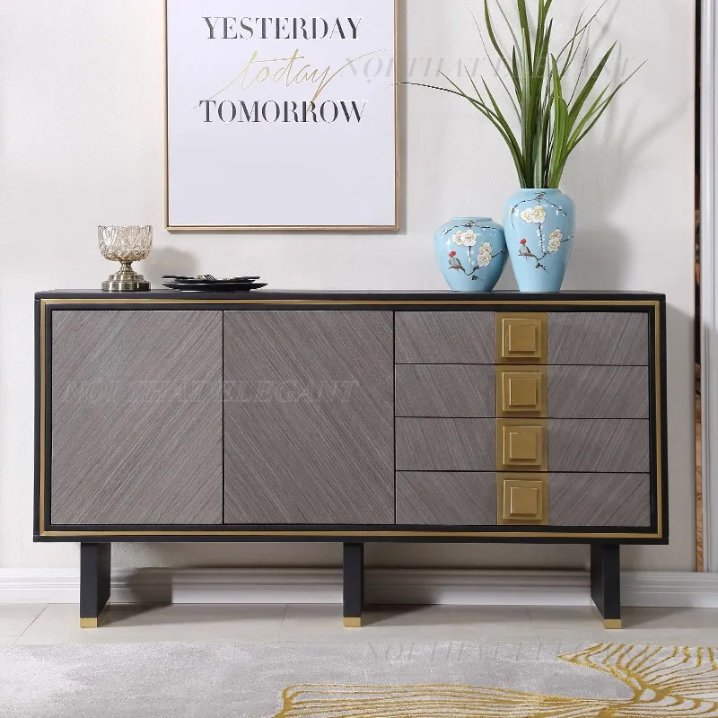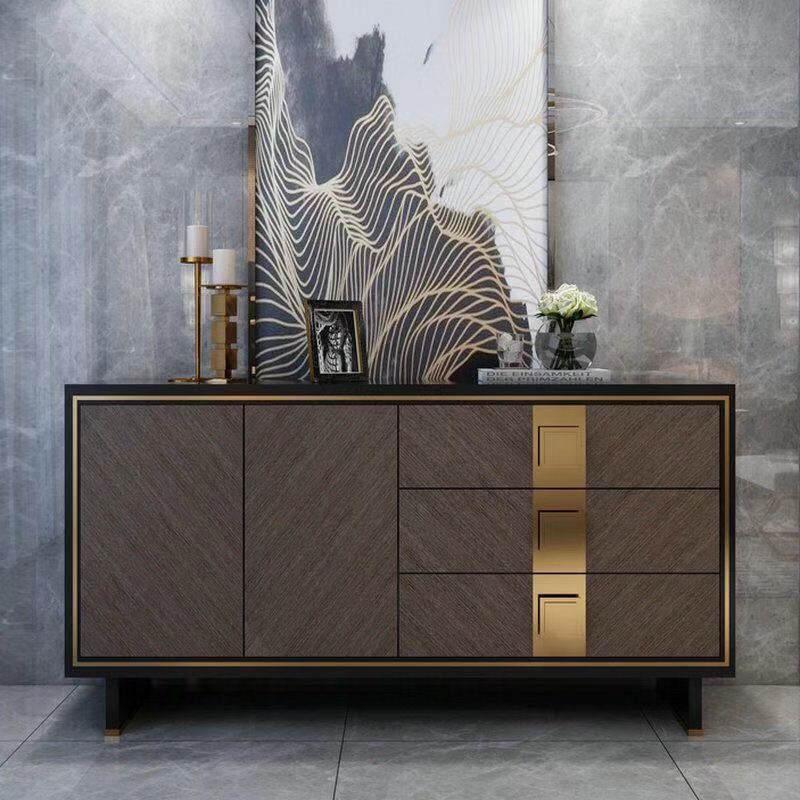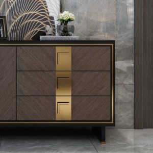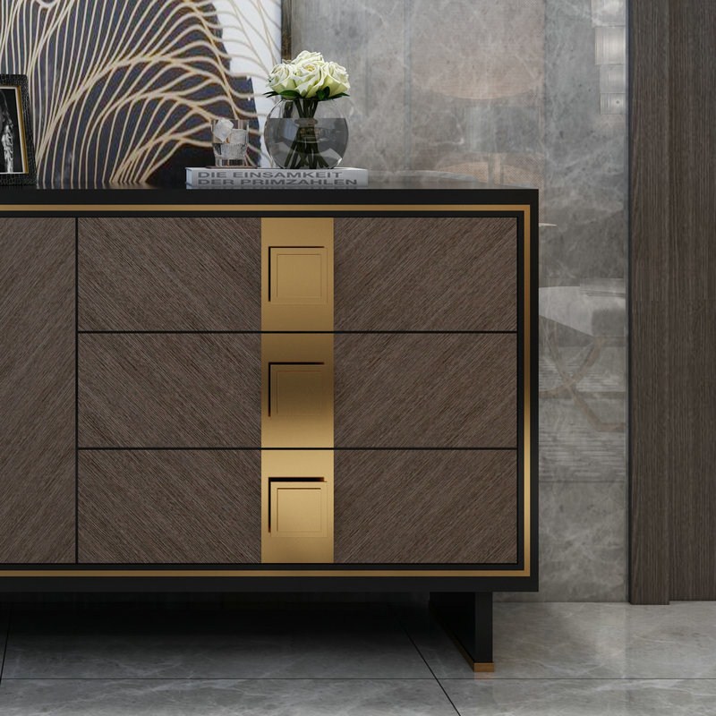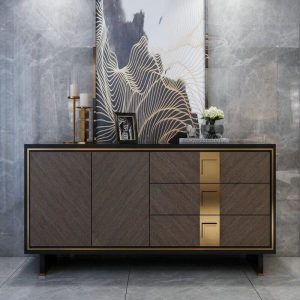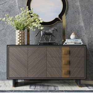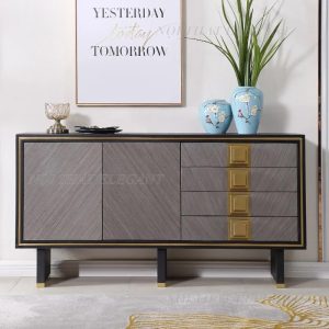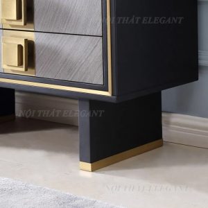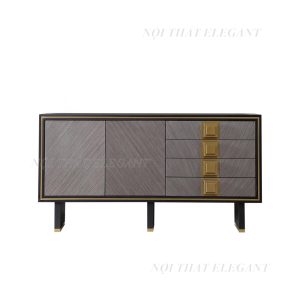 Tủ Console EL07 là mẫu nội thất cao cấp mang phong cách hiện đại, được thiết kế với đường nét tinh giản nhưng vô cùng tinh tế. Sản phẩm nổi bật với sự kết hợp hài hòa giữa gỗ veneer màu nâu xám và chi tiết kim loại mạ vàng sang trọng, tạo nên vẻ đẹp đẳng cấp cho mọi không gian.