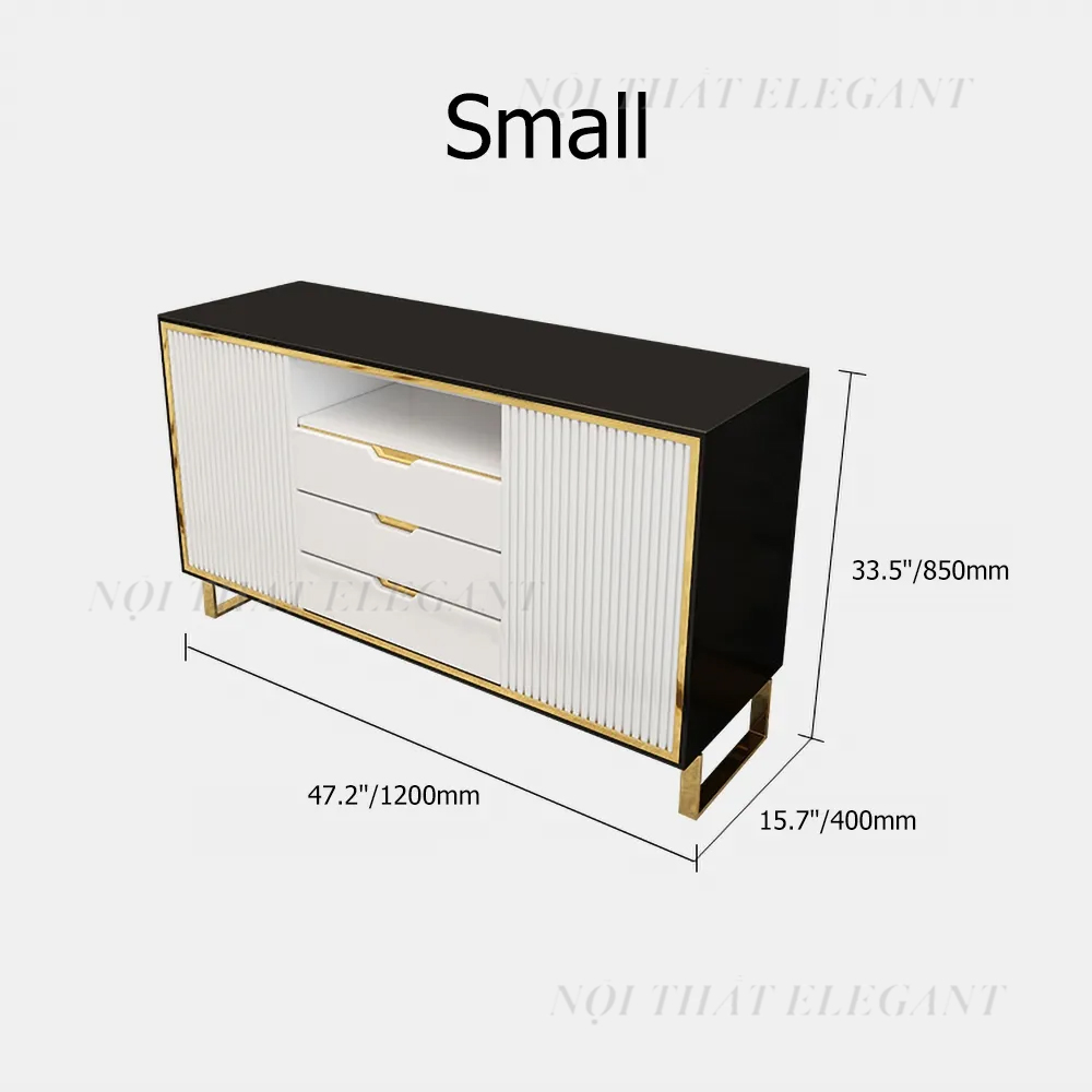 Tủ Console EL11 là mẫu tủ trang trí cao cấp nổi bật với phong cách hiện đại – sang trọng. Thiết kế phối màu đen – trắng tinh tế kết hợp viền vàng thời thượng tạo nên vẻ đẹp đẳng cấp, phù hợp đặt tại phòng khách, sảnh nhà, phòng ăn hay khu vực trang trí của mọi ngôi nhà.
