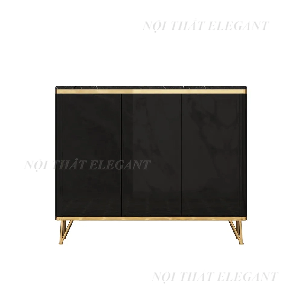 Tủ giày với thiết kế sang trọng, thanh lịch, nổi bật với màu sơn đen bóng tạo vẻ đẹp cao cấp cho khu vực sảnh ra vào của ngôi nhà. Đặc biệt với mặt bàn đá cùng khung chân làm từ inox 304 mạ PVD cao cấp màu vàng bóng càng tôn thêm vẻ đẹp tinh tế và đẳng cấp cho sản phẩm. Các ngăn chia bên trong có thể điều chỉnh kích thước để phù hợp với nhiều mẫu giày khác nhau giúp không gian thêm gọn gàng và sạch sẽ hơn .