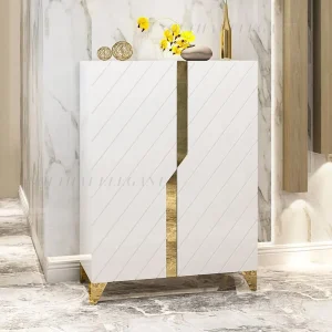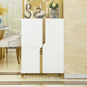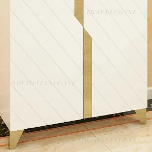 Tủ giày với thiết kế hiện đại, lớp sơn trắng bóng trang nhã và inox mạ PVD màu gold làm điểm nhấn mang lại sự sang trọng, tinh tế cho khu vực lối vào . Với các ngăn bên trong có thể điều chỉnh giúp bạn để những đôi giày có kích thước khác nhau gọn gàng và sạch sẽ hơn.